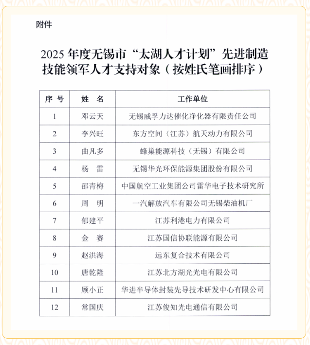 近日,无锡市正式发布《2025年度无锡市“太湖人才计划”申报公告》及相关配套文件,公布了本年度“太湖人才计划”先进制造技能领军人才项目支持对象名单。华光环能装备事业部杨雷同志凭借过硬的专业技能和突出的岗位贡献,成功入选该名单,成为全市12名入选者之一。
